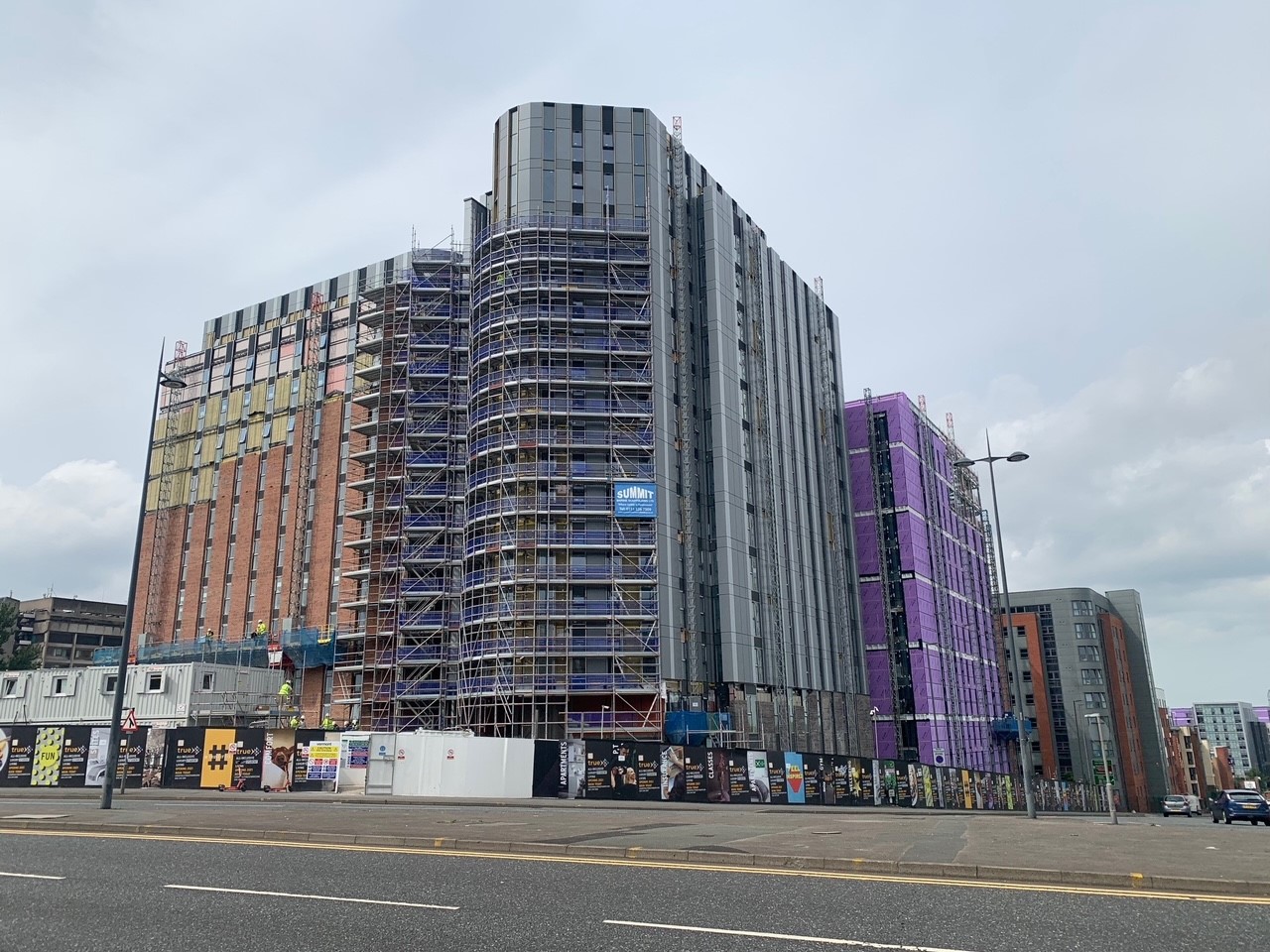 Blocks 1,2 & 3 are now approaching completion with final stages of internal fit out currently ongoing.  Brickwork & cladding continuing to all elevations, with scaffold stripping ongoing.  Blocks 4 & 5 structural frame close to completing with the glazing installation going in to Erskine Street elevation.  Pod delivery and SFS installation in progress to Block 5.